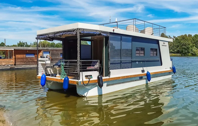Dieses komfortable Hausboot in Neuruppin bietet Ihnen volle Mobilität und Freiheit, ausgestattet mit einem leistungsstarken 60-PS-Außenborder.