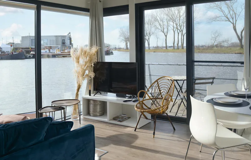 Im Inneren des Hausbootes finden Sie einen modern gestalteten Wohnbereich mit offener Küche, einem gemütlichen Essplatz und einer Sofaecke. Große Fenster schenken Ihnen einen herrlichen Blick aufs Wasser, während Sie entspannen oder gemeinsam kochen.