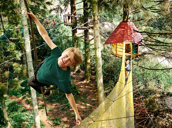 Es geht hinauf in bis zu 14 Meter hohe Baumhäuser, rasant die Rutschen hinunter und über wackelige Hängebrücken von Baum zu Baum. Große Netze mit Riesenbällen laden zum Hüpfen ein, wilde Schaukeln und Seilbahnen sorgen für Nervenkitzel. Wer mag, erkundet geheimnisvolle Labyrinthe oder kriecht durch unterirdische Gänge und Höhlen auf spannender Entdeckungstour.